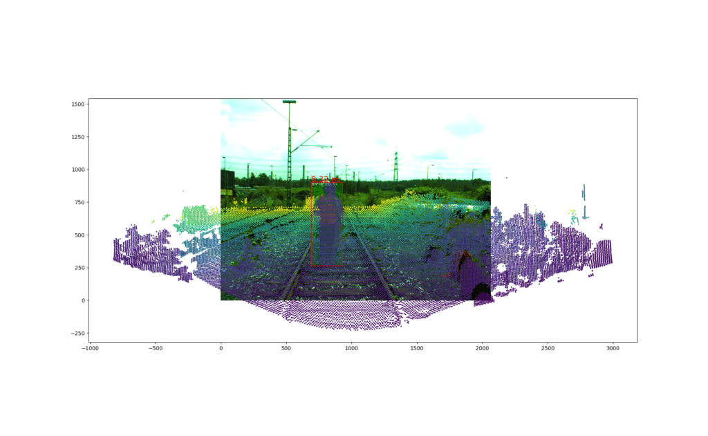 These objects are detected by fusing camera images and 3D point clouds: image recognition algorithms identify the track area and objects such as people or vehicles based on the camera image. However, they cannot determine the exact position of detected objects; only the fusion with the point cloud enables this step. This way, it can be ensured that the train’s path is clear when reversing, without a shunting assistant.