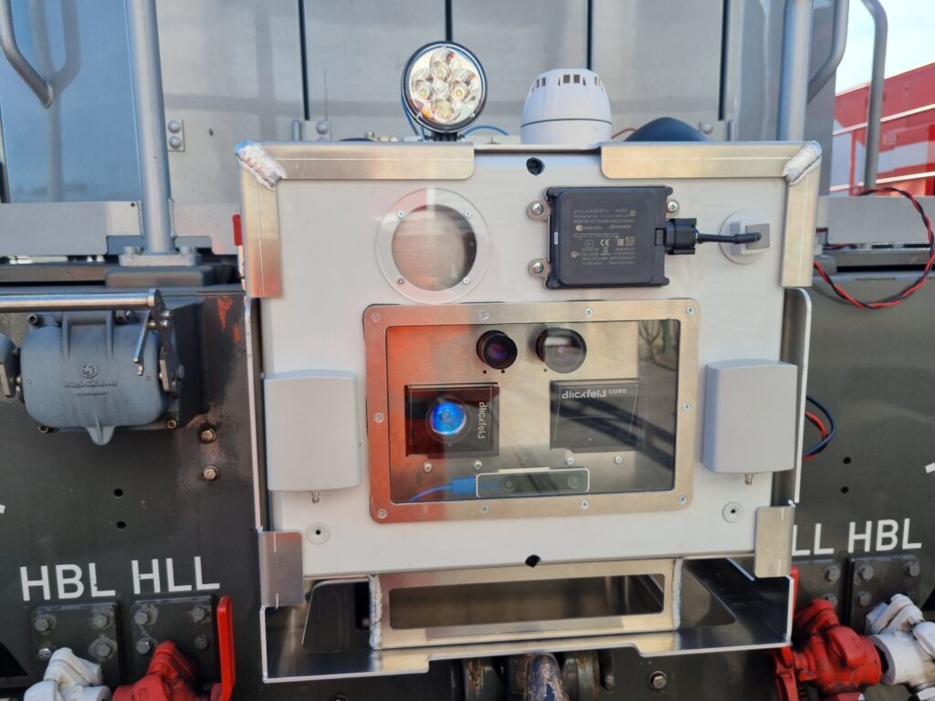 Therefore, the project team is developing an assistance system for shunting freight trains that takes over track monitoring and thus supports the locomotive drivers. This portable, battery-powered device is attached to the end of the train. It contains a wide range of sensors for detecting the environment and a computer for data processing. The integrated sensors include two Blickfeld LiDAR sensors for 3D obstacle detection, a stereo camera for close-range detection, two additional cameras that provide the data basis for algorithm-based object detection, and a radar sensor. In addition, the system has an acoustic warning signal. The locomotive driver is equipped with a tablet in the cab that shows the track area behind the train in the live feed and indicates objects, people, signals, or other vehicles in the monitored area.